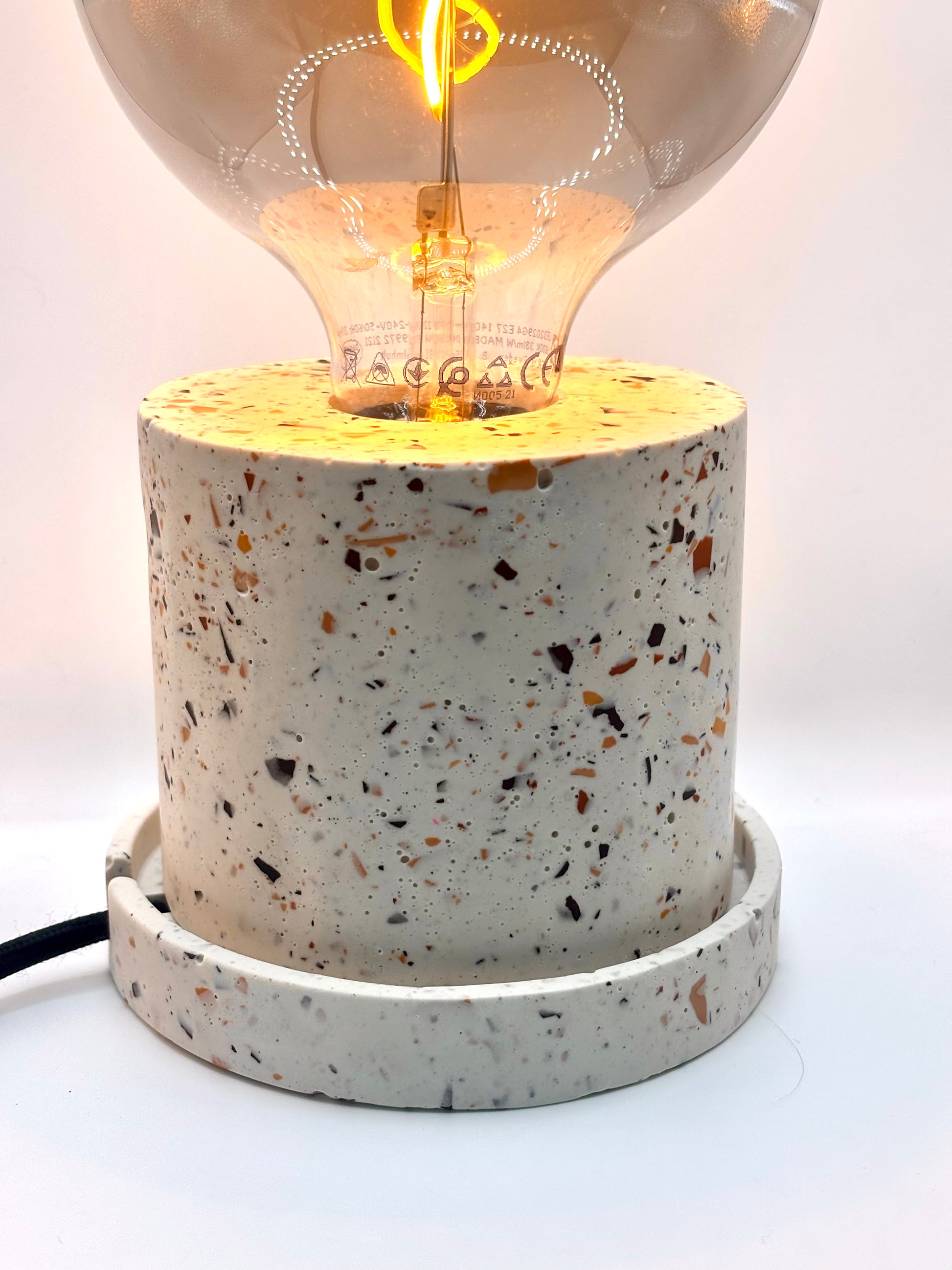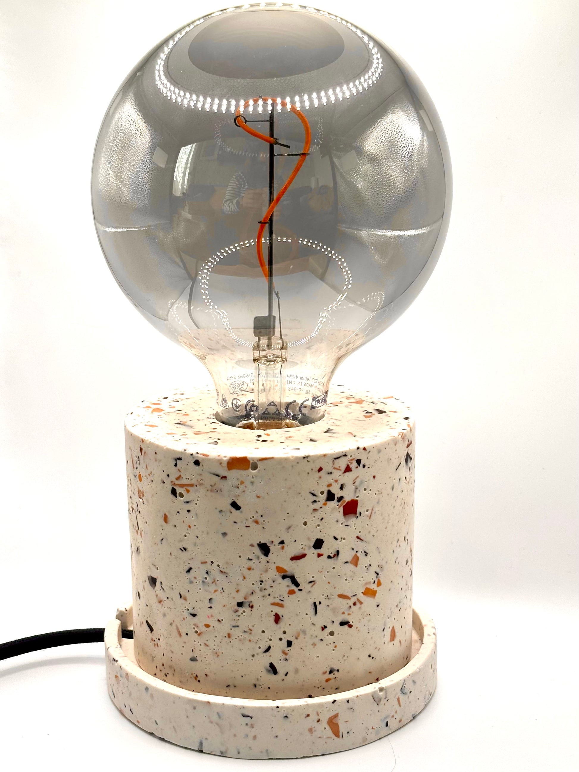 Diese einzigartige Tischlampe besteht aus umweltfreundlichem Harz mit Pigmenten, die ihr einen marmorierten Effekt verleihen.