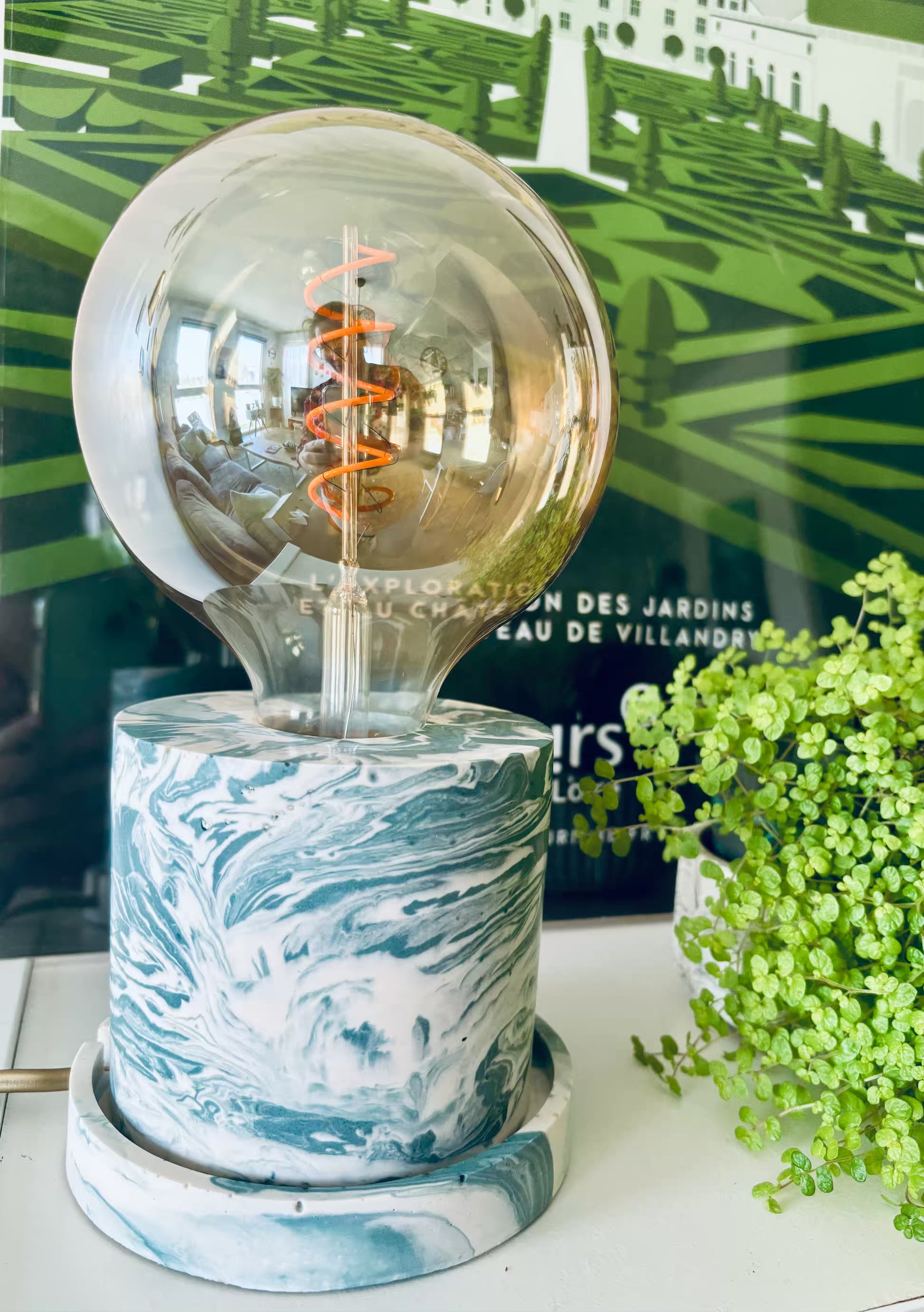 Diese einzigartige Tischlampe besteht aus umweltfreundlichem Harz mit Pigmenten, die ihr einen marmorierten Effekt verleihen.